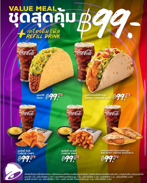 ซึ่งเมนูอาหารเม็กซิกันรสชาติเข้มข้นหลากหลายสไตล์ของเรา จะเสิร์ฟพร้อมเครื่องดื่มรีฟิลเย็นฉ่ำชื่นใจ เพื่อให้ทุกคนได้รับความสดชื่นไปตาม ๆ กัน ในราคาเพียง 99 บาท เท่านั้น ! ใครที่อยากเลือกเมนูความอร่อยตามสไตล์ของตัวเอง อย่ามัวรอช้า ตามไปสั่งกันได้เลยที่ทาโก้ เบลล์ทุกสาขา 💜